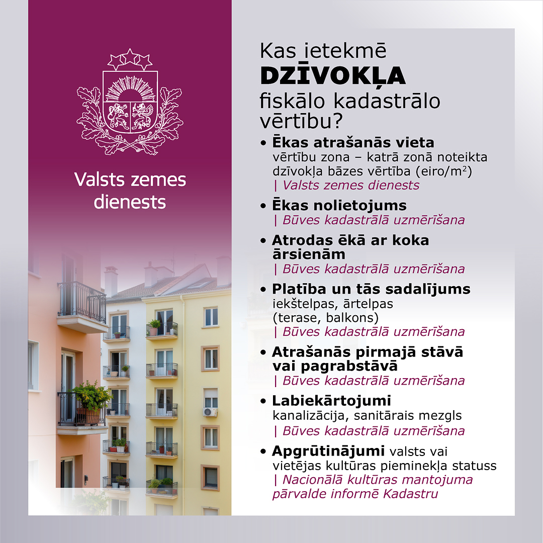 Infografikas: Kādi dati ietekmē dzīvokļa, privātmājas, apbūves zemes un lauku zemes fiskālo kadastrālo vērtību?