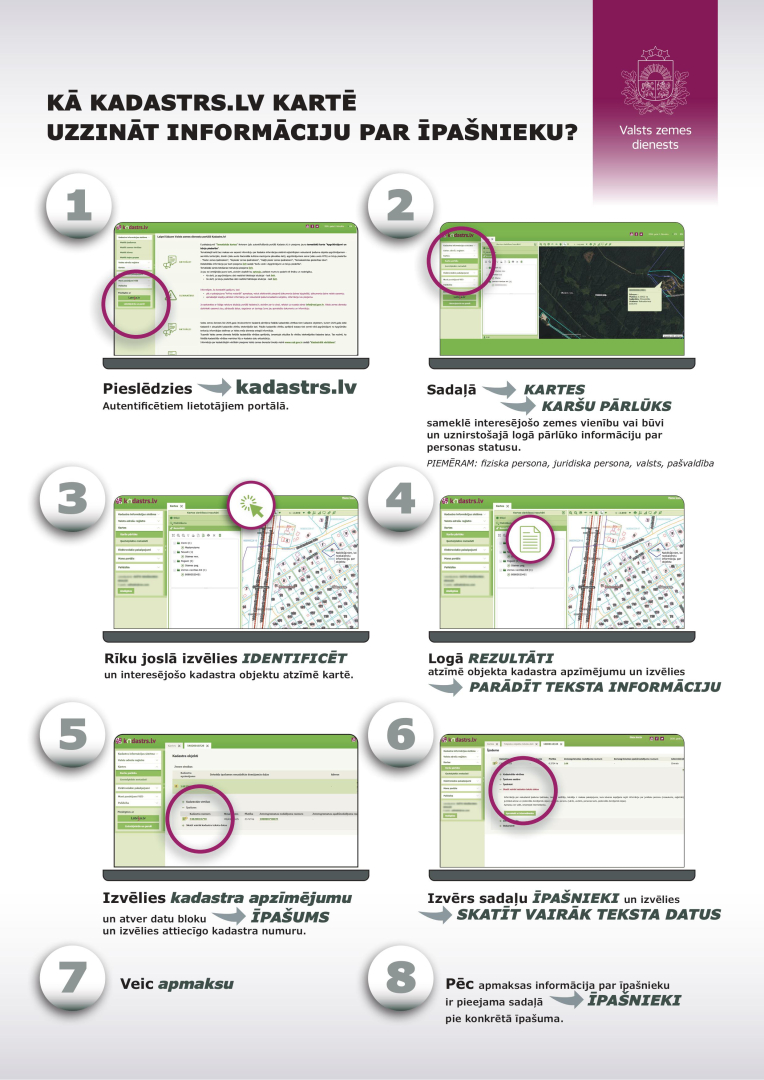Lai iedzīvotājiem būtu vienkāršāk un skaidrāk saprotams, kā izmantojot portāla Kadastrs.lv karšu pārlūka funkcionalitāti var noskaidrot informāciju par nekustamā īpašuma personas statusu un informāciju par nekustamā īpašuma īpašnieku, tiesisko valdītāju vai lietotāju, Valsts zemes dienests ir sagatavojis “ceļa karti” un lietošanas instrukciju – “Kā Kadastrs.lv kartē uzzināt informāciju par īpašnieku”?