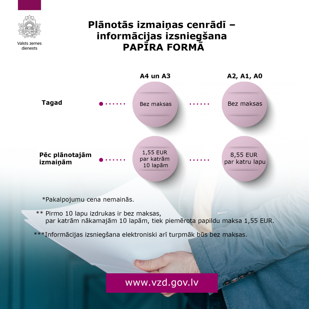 Lai veicinātu sabiedrību izmantot pakalpojumu materiālu elektroniskos izsniegšanas kanālus, aktualizētais VZD maksas pakalpojumu cenrādis paredz izmaiņas arī informācijas izsniegšanas pakalpojumos, papildu pakalpojuma esošajai maksai ieviešot maksu par papīra materiālu izsniegšanu. Turpmāk par jebkāda dokumenta (A3 un A4 formātā) izsniegšanu papīra formā, kas pārsniedz 10 lapas, ir plānots noteikt papildu maksu 1,55 euro apmērā. Savukārt par katru lielformāta (A2, A1 un A0) izdruku papīra formā 8,55 euro, kas ietver izmaksas tā sagatavošanai un izsniegšanai. Minētās papildu maksas attiecas tikai uz papīra izdrukām, dokumentu saņemot elektroniski, tās netiek piemērotas. Turklāt jānorāda, ka pašu informācijas izsniegšanas pakalpojumu cena nemainās, piemēram, arī turpmāk par vienu arhīva dokumentu būs jāmaksā 3 euro, bet par vienu arhīva lietu 15 euro.